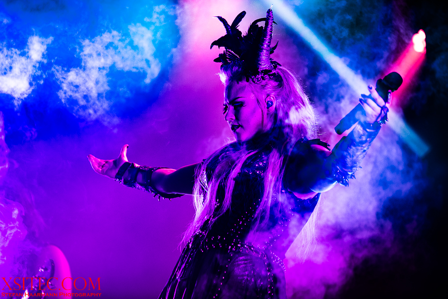 BATTLE BEAST haben sich ihrerseits auch nicht lumpen lassen und eigenes Bühnenlicht mit nach Bochum gebracht. Zusätzlich stehen auf der Bühne farbig illuminierte Nebelfontänen, die der Show zusätzliche Effekte verleihen. Noora Louhimo glänzt mit eindrucksvollem Gesang, der druckvoll und voller stimmlicher Facetten ist. Die Frontlady scheut sich auch nicht, die teilweise schwindelerregenden Tonhöhen, bei der viele ihrer Kolleginnen schlicht passen müssten, auch „Live“ auf die Bühne der Zeche zu bringen.