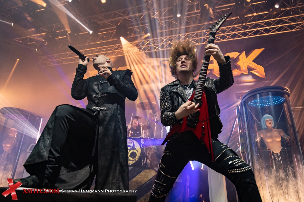 Der Umbau der Bühne danach ist etwas aufwändiger, da BEAST IN BLACK sich für ihre Tour eine Bühnendeko ausgedacht haben, in der zwei weibliche Cyborgs in gläsernen Litfass-Säulen das Schlagzeug-Podest Atte Palokangas´ flankieren. „Blade Runner“ vom aktuellen Album „Dark Connection“ eröffnet den Reigen der von Science-Fiction Serien und Comics inspirierten Titeln der Finnen, deren musikalischer Fokus eindeutig auf Spaß ausgerichtet ist. Somit ist eine BEAST IN BLACK Show immer eine ganz besondere Veranstaltung, die von der positiven Energie der Akteure lebt, deren Posings selten bierernst, meistens aber völlig überdreht und komisch zu nennen sind.