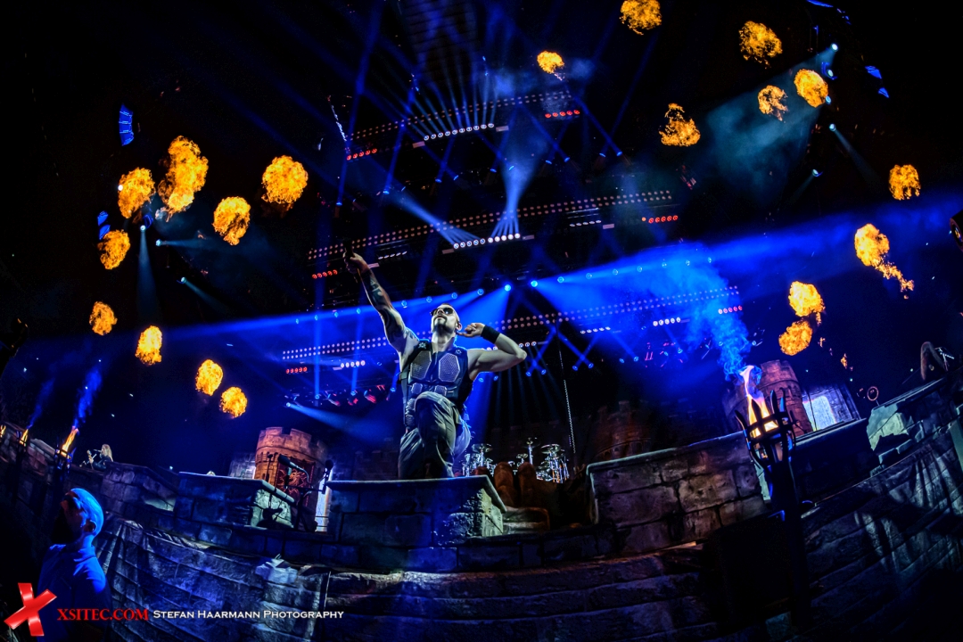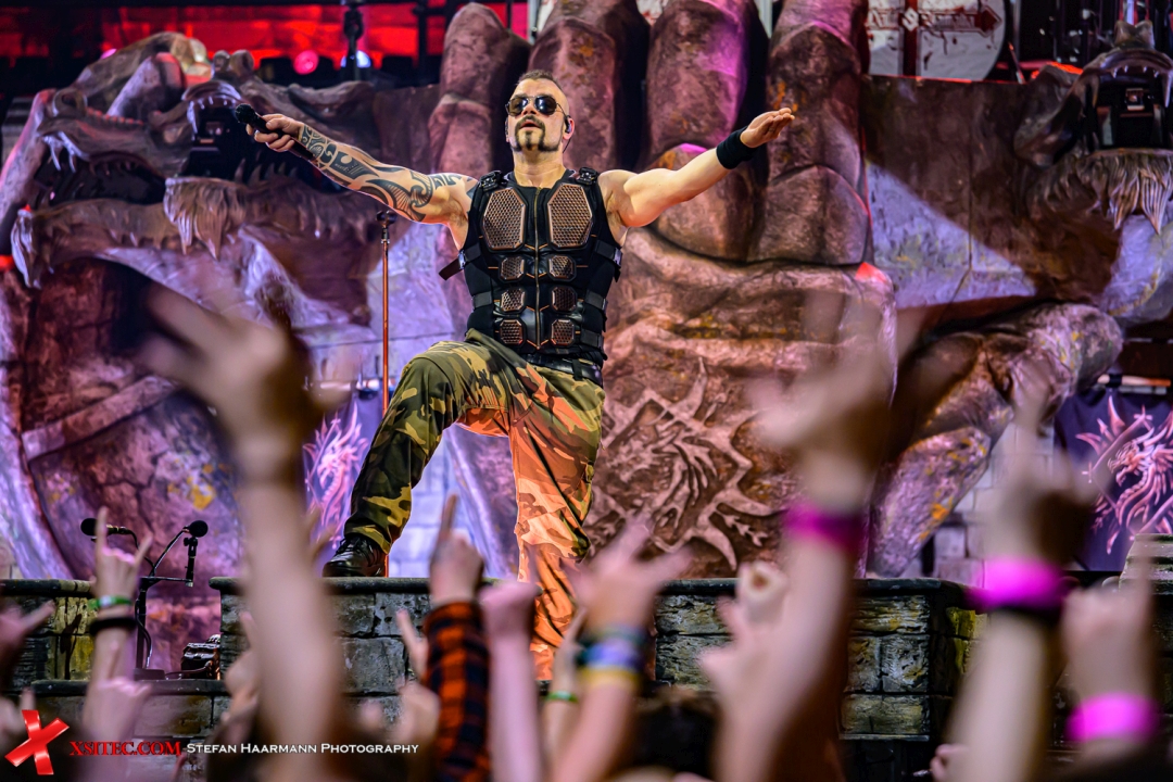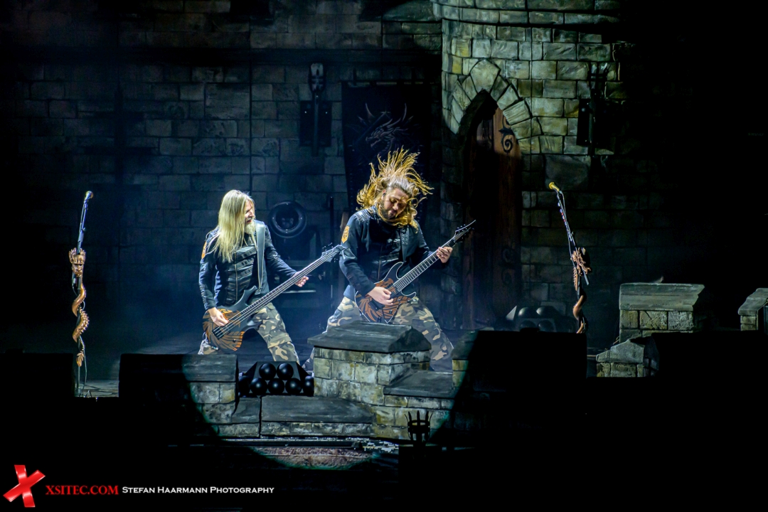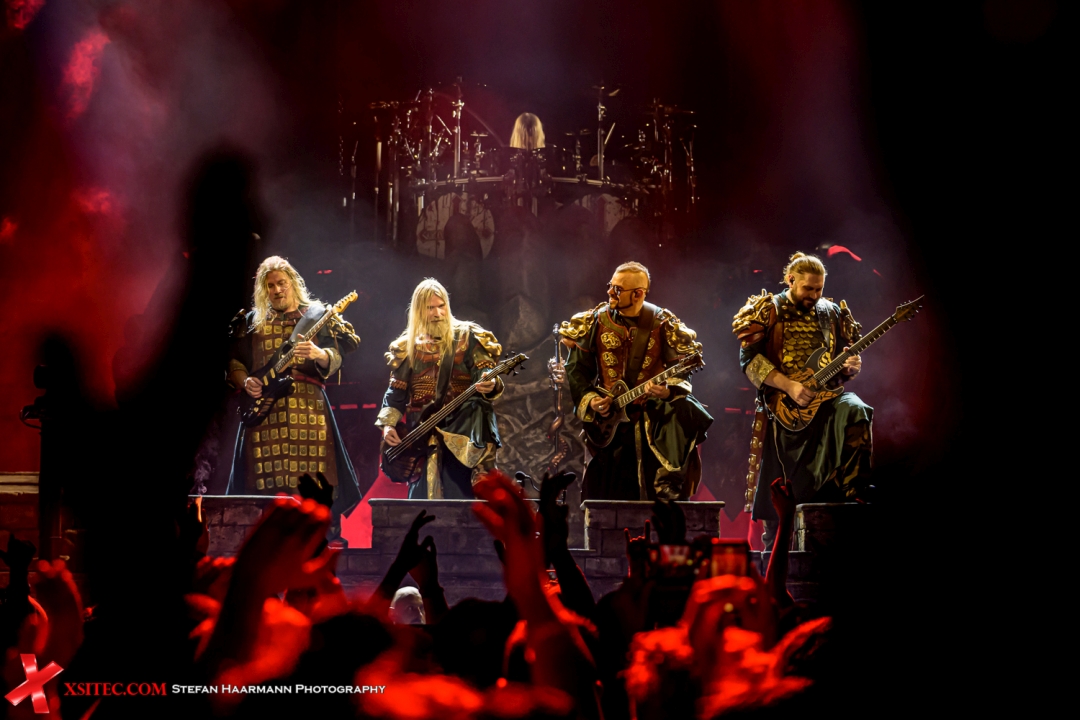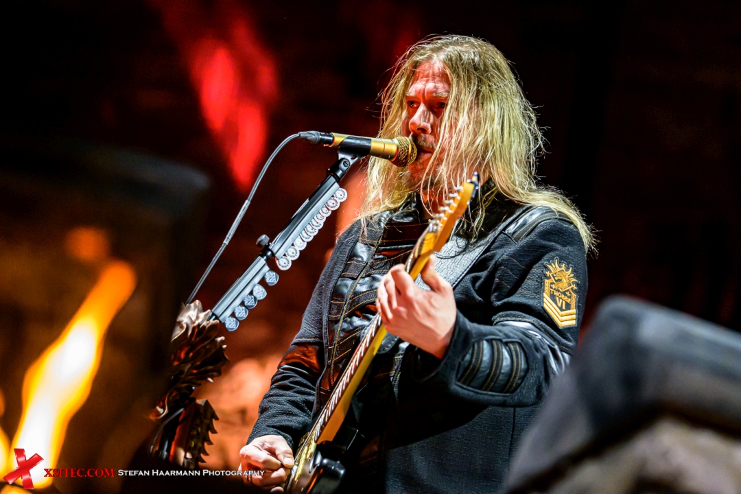 Das ganze spielt sich auf der Nebenbühne ab, die wie bereits oben erwähnt bei Bedarf durch eine mächtige Hängebrücke mit der Hauptbühne verbunden werden kann. Als dann endlich die eigentlichen Hautdarsteller aus dem Off erscheinen, brandet unglaublicher Jubel auf, der die Band bei „Templars“ in ohrenbetäubendem Jubel baden lässt. Im Laufe des Songs wechseln die in Templer-Gewänder gehüllten Mannen um Frontmann Joakim Brodén über die Zugbrücken auf die Hauptbühne, auf der bereits Schlagzeuger Hannes Van Dahl sehnsüchtig auf seine Mitstreiter wartet. Somit ist dann das folgendende „The Last Stand“ auch nicht wörtlich zu nehmen, da alle SABATON Musiker nun vereint die Halle aufmischen. Neben Joakim Brodén und Hannes Van Dahl greifen an diesem Abend Thobbe Englund (Gitarre), Chris Rörland (Gitarre), sowie Pär Sundström (Bass) zu den Instrumenten.
