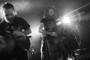 Karl Lauterbach gefällt das – nicht: "Wenn ich das nächste Mal eine Lungenentzündung habe, gehe ich nicht so schnell auf eine Bühne", unkt STEORRAH-Sänger und -gitarrist Andreas März zwischen zwei Liedern. Immerhin, anfängliche kleinere Ungenauigkeiten hat seine erst kurz zuvor mit neuem Bassisten ausgestattete Band zu diesem Zeitpunkt schon weitgehend hinter sich gelassen und spielt derweil ziemlich souverän auf. Beim gut gefüllten MTC handelt es sich zwar nicht um ein "Altstadt Abyss" im engeren Sinne, doch das Quartett aus der Bonner Nachbarschaft fühlt sich im Kölner Club offenbar wohl, denn es reißt einen bemerkenswerten Gig ab, der so stark auf Kontraste setzt wie selten zuvor: Aus den Anfangstagen der zunächst oft mit Opeth verglichenen Band rührt der finstere, mitunter drückend massive Metal her, dem die Bezeichnung "Death" schlichtweg nicht mehr gerecht wird, gleichwohl Andreas noch viel growlt – erbaulicher sind vor allem die mit Gitarrist Nicolao dos Santos im Duett gesungenen Zeilen. Damit verwoben werden Passagen, in denen STEORRAH viel Raum für Töne lassen, die manchmal eben nicht auf den Sechs- bis Siebensaitern gespielt werden, sondern sich aus einer gewissen Zurückhaltung ergeben – das ist ganz großes musikalisches Kino und weist weit über herkömmlichen Metal hinaus. Könnt Ihr Euch etwas unter Dark Chillout Metal vorstellen? Falls nicht, doch Eure Neugier geweckt ist, dann tut Euch einen Gefallen und besucht ein Konzert der Jungs! Denn auch wenn STEORRAH ganz klar mehr auf Melodie und Atmosphäre als auf Aggression setzen, so entwickeln sie immer wieder eine gewisse Wucht, und Nicolao dos Santos setzt gelegentlich Akzente im "fast forward" Modus, die jedoch nie in sinnbefreites Gefrickel ausarten, sondern den Song tragen. Eine starke Performance einer Band, die seit etlichen Jahren ihren ganz eigenen Stil entwickelt.